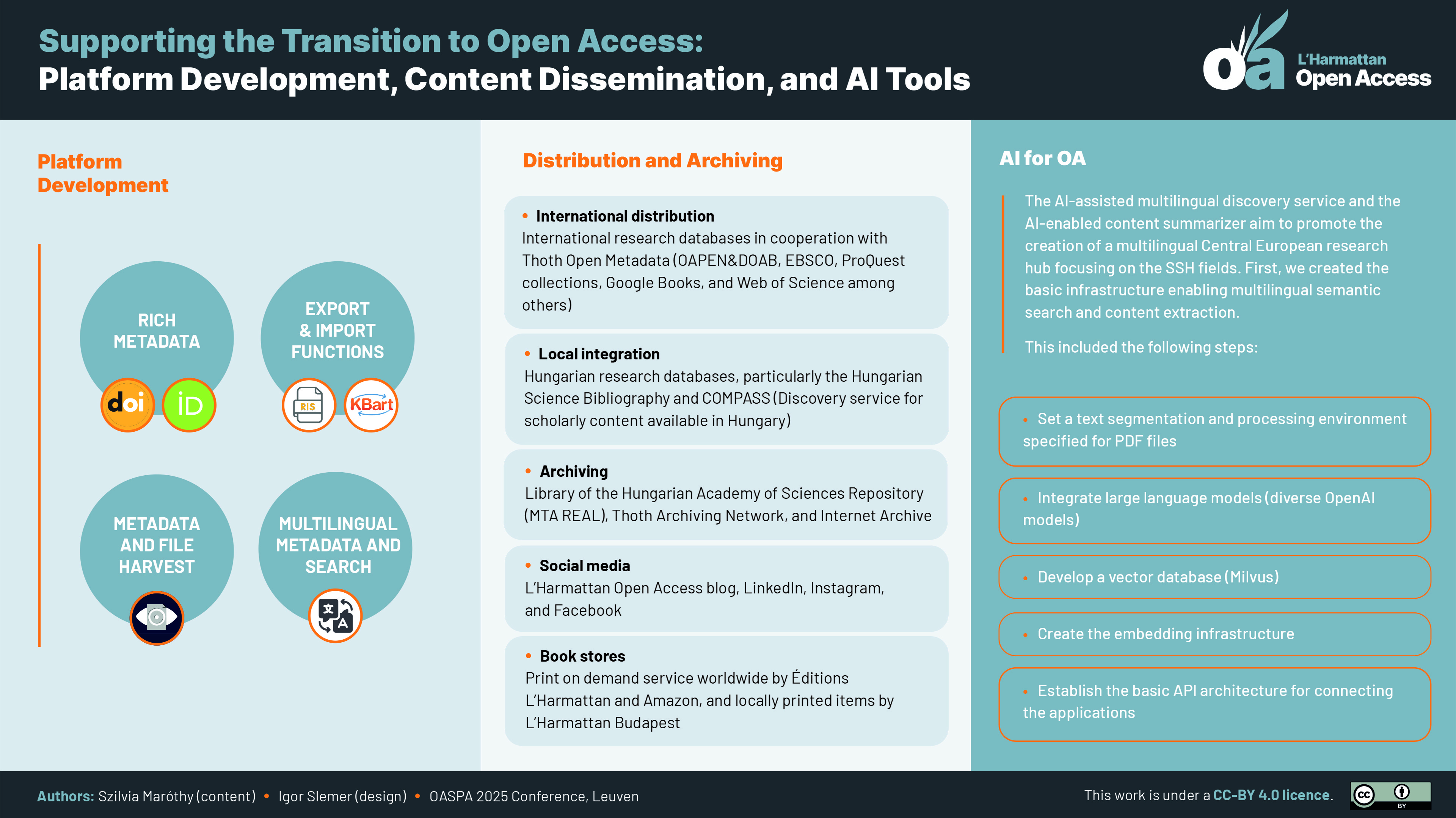 Szilvia Maróthy, “Supporting the Transition to Open Access: Platform Development, Content Dissemination, and AI Tools”, graphic design by Igor Slemer. Poster presented at OASPA Conference, Embracing the Complexity – how do we get to 100% OA? Leuven, 22-24 September 2025. https://www.doi.org/10.5281/zenodo.17198778